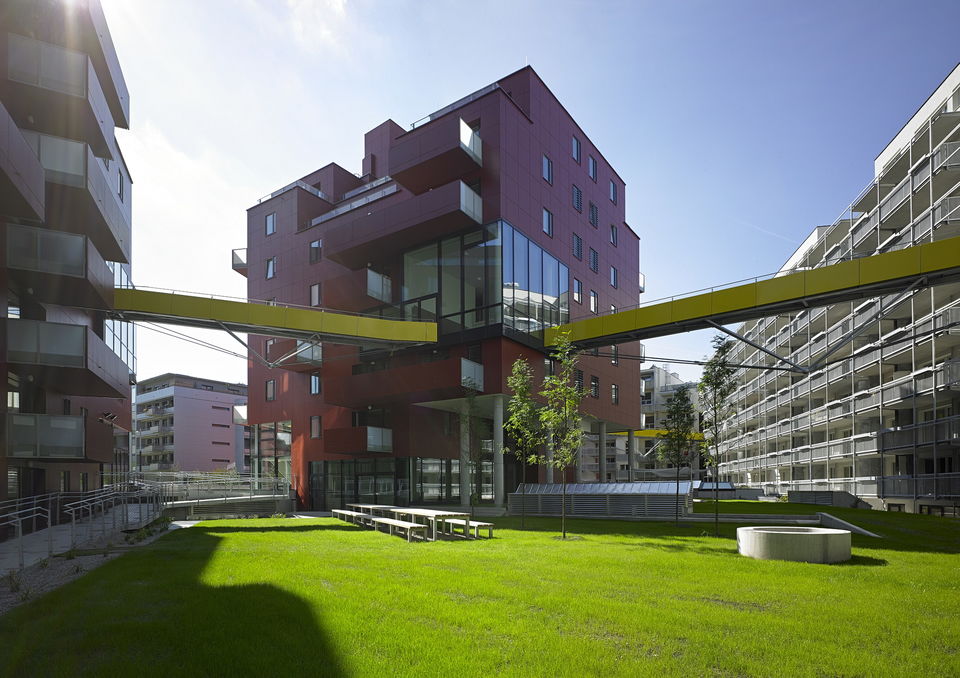 One of the most significant projects of the Sonnwendviertel is win4wien, which won the ‘Landlord of the Year 2015’ award. The entire construction site can be interpreted as single, shared accommodation: The Living_Room. It adds value to the individual apartments in terms of atmosphere, space and opportunities. It invites you to “live beyond” your own four walls. Activities such as reading or communal cooking find new spaces in the Living_Room. Another linking level (including bridges) in the 3rd or 4th floor connects to the ground floor level so that there is also a quick and direct access to the communicative “communal living room” from the apartments higher up. The open structure is based around a central area which offers a theatre, a market, a library and a swimming pool.